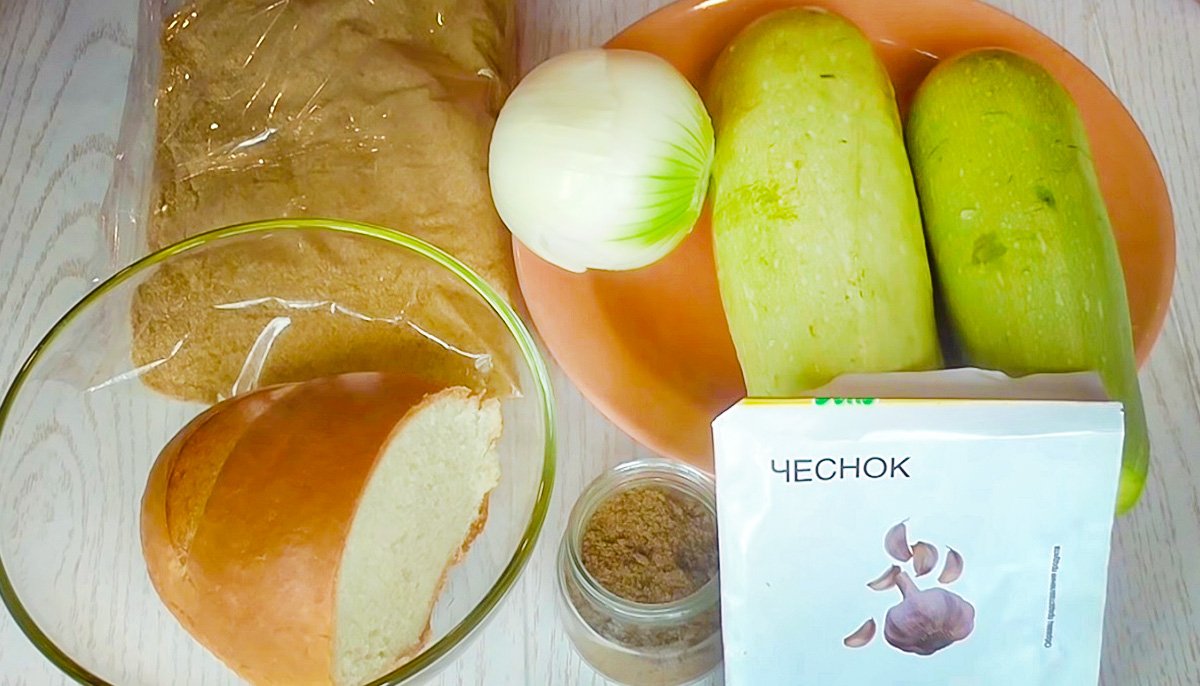 - Сперва нужно замочить батон в воде. Или же дождаться, пока у нас появится сок из кабачков.