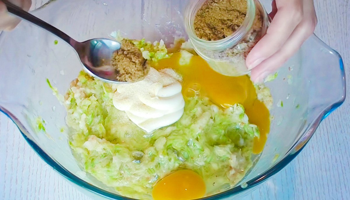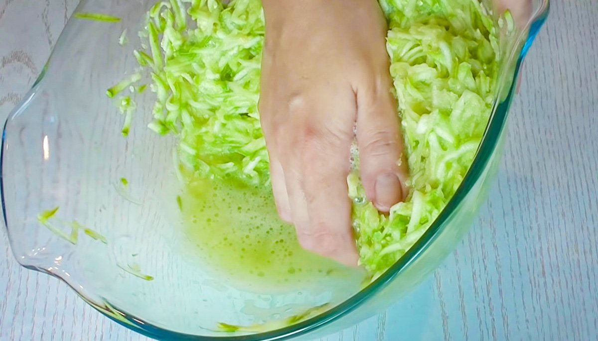 - Когда в миске с кабачками появится много жидкости, их нужно отжать, чтобы отделить всю лишнюю влагу. К отжатым кабачкам добавь лук и батон, перемешай всё вместе.