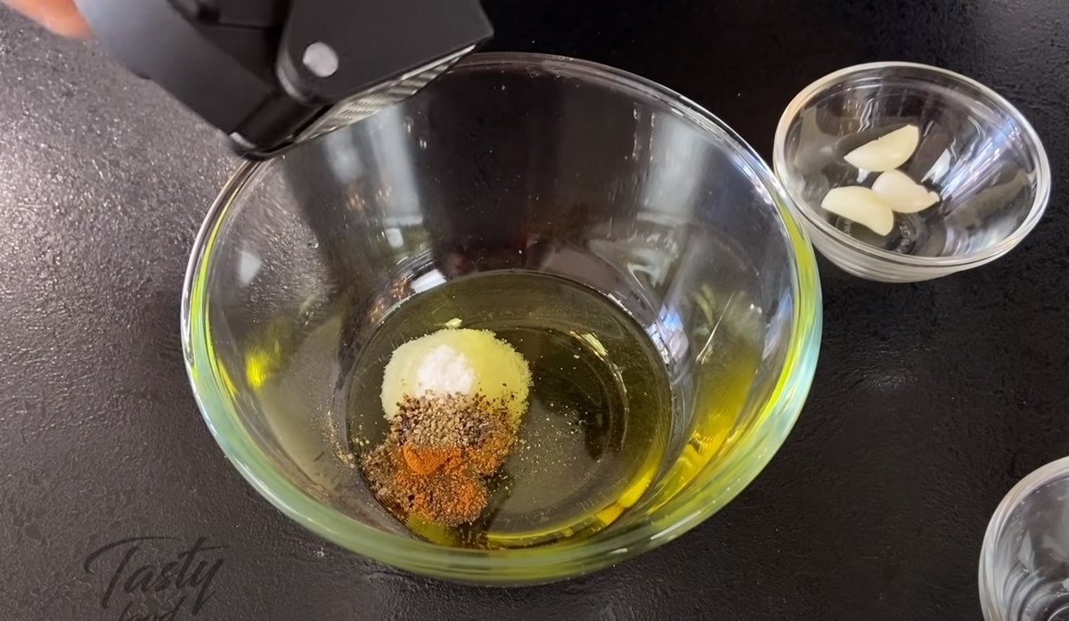 © YouTube - Размешай подсолнечное масло со специями. Пропусти чеснок через пресс и тоже смешай с этими ингредиентами. Добавь соус к картошке и дай постоять 5–10 минут.