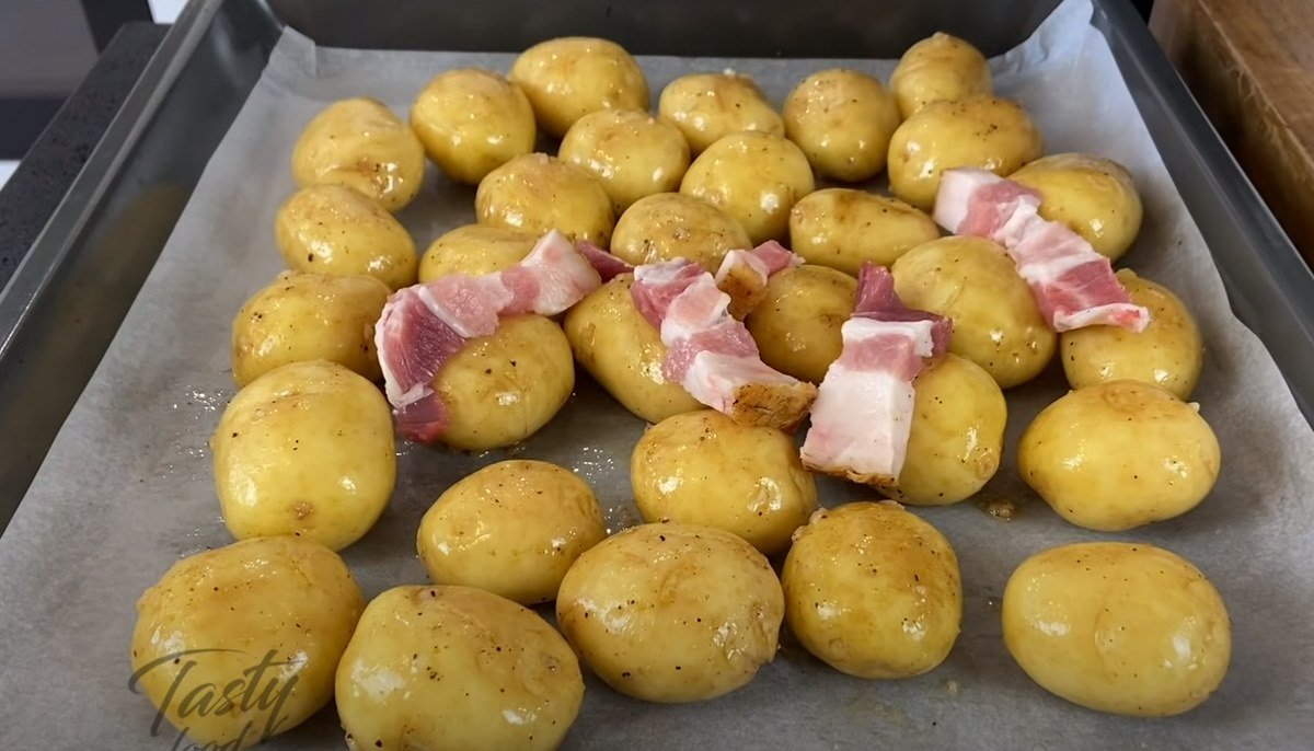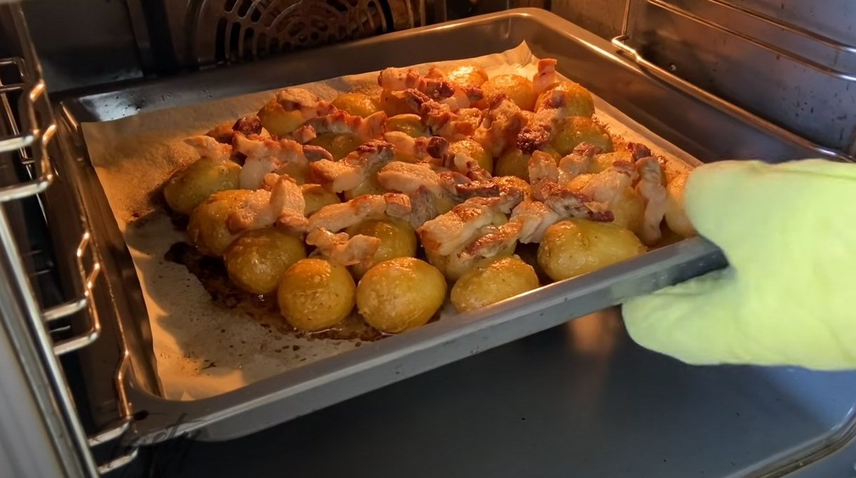 © YouTube - Разогрей духовку до 200 градусов и отправь туда картошку с салом. Она будет готовиться около 45 минут.