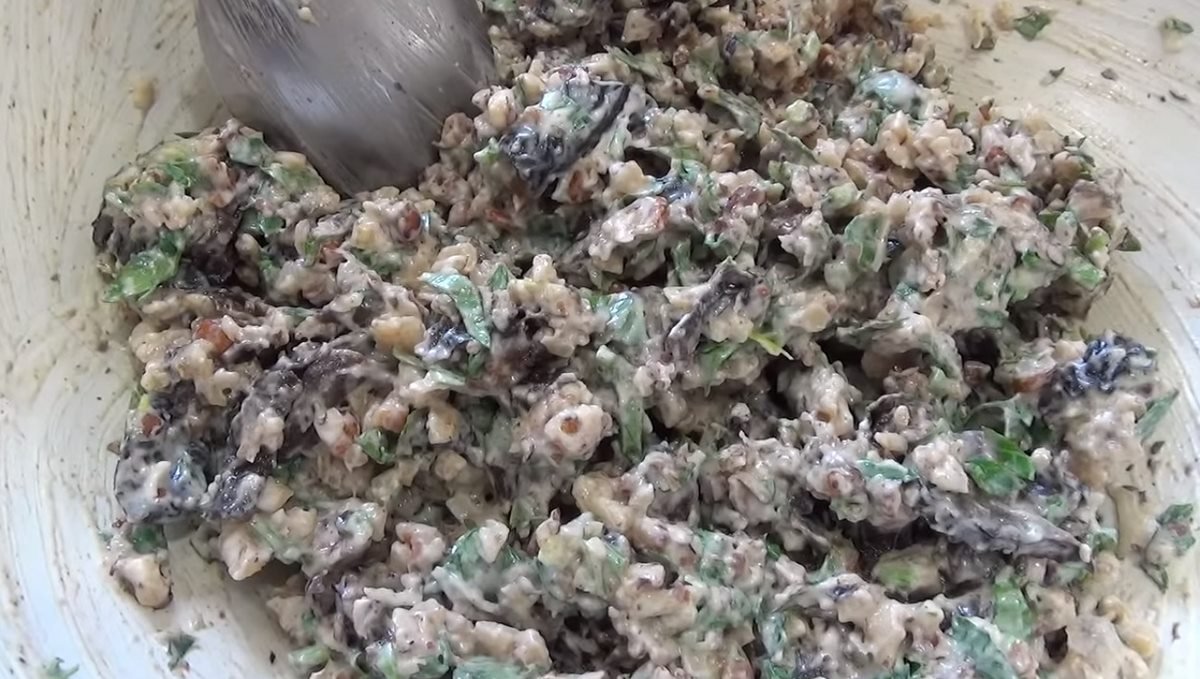 - Теперь смешай чернослив, петрушку, чеснок, орехи и добавь майонез. Затем хорошо перемешай начинку.