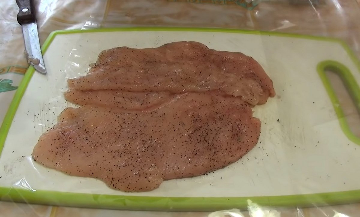 - Далее куриное филе нужно накрыть второй пленкой и хорошо отбить плоским молоточком с двух сторон. Также нужно поступить и с малым филе.