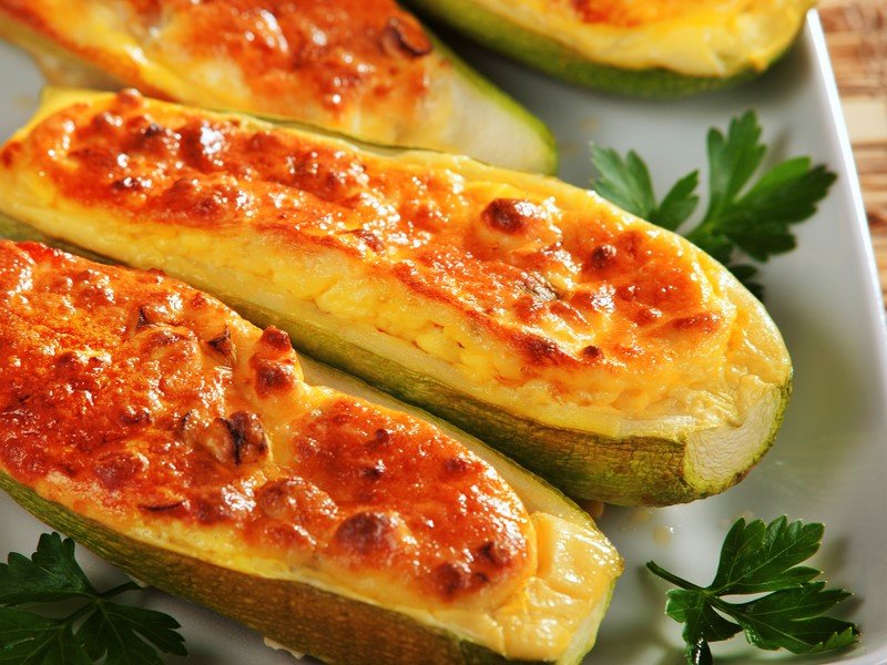 - Заранее подготовленные лодочки из кабачков заправь начинкой, сверху присыпь сыром и отправь в разогретую до 180 градусов духовку на 30 минут в режиме «Верх-низ».