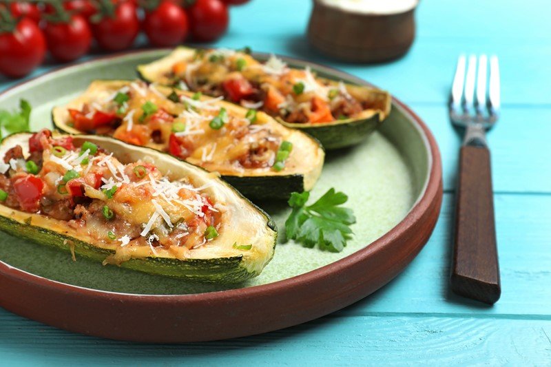 Существует две школы приготовления фаршированных кабачков. Истинные аккуратисты начиняют разнообразной вкуснятиной весь овощ. Выглядит такое блюдо в готовом виде грандиозно, но и заморочиться с ним нужно как следует. Большинство же попросту рубит кабачки пополам и заполняет начинкой каждую половинку отдельно. Получаются своеобразные лодочки из кабачков, блюдо до упомомрачения сытное, но при этом весьма полезное!