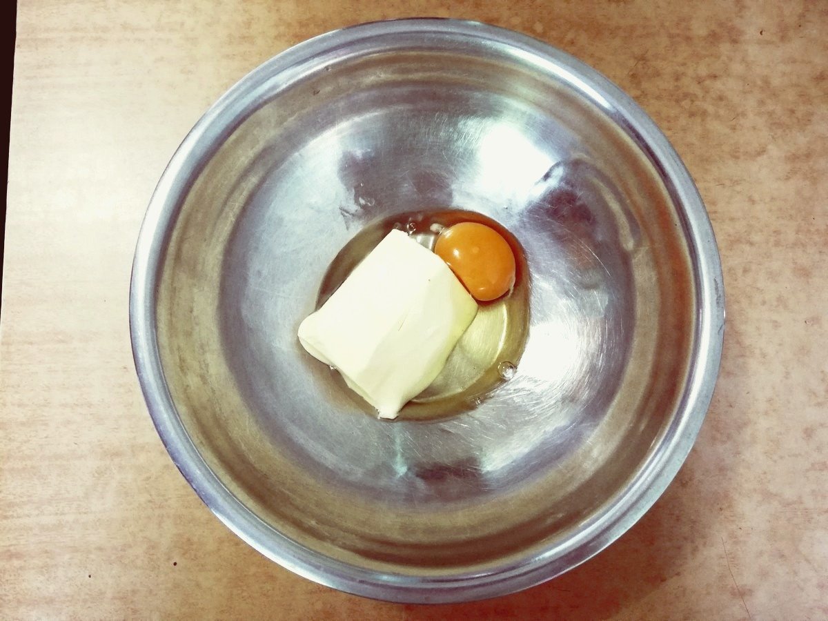- Мягкое сливочное масло нужно размять вилкой. На этом этапе не нужно усердствовать. Если поначалу оно будет комочками, ничего страшного. Вмешай к маслу яйцо.