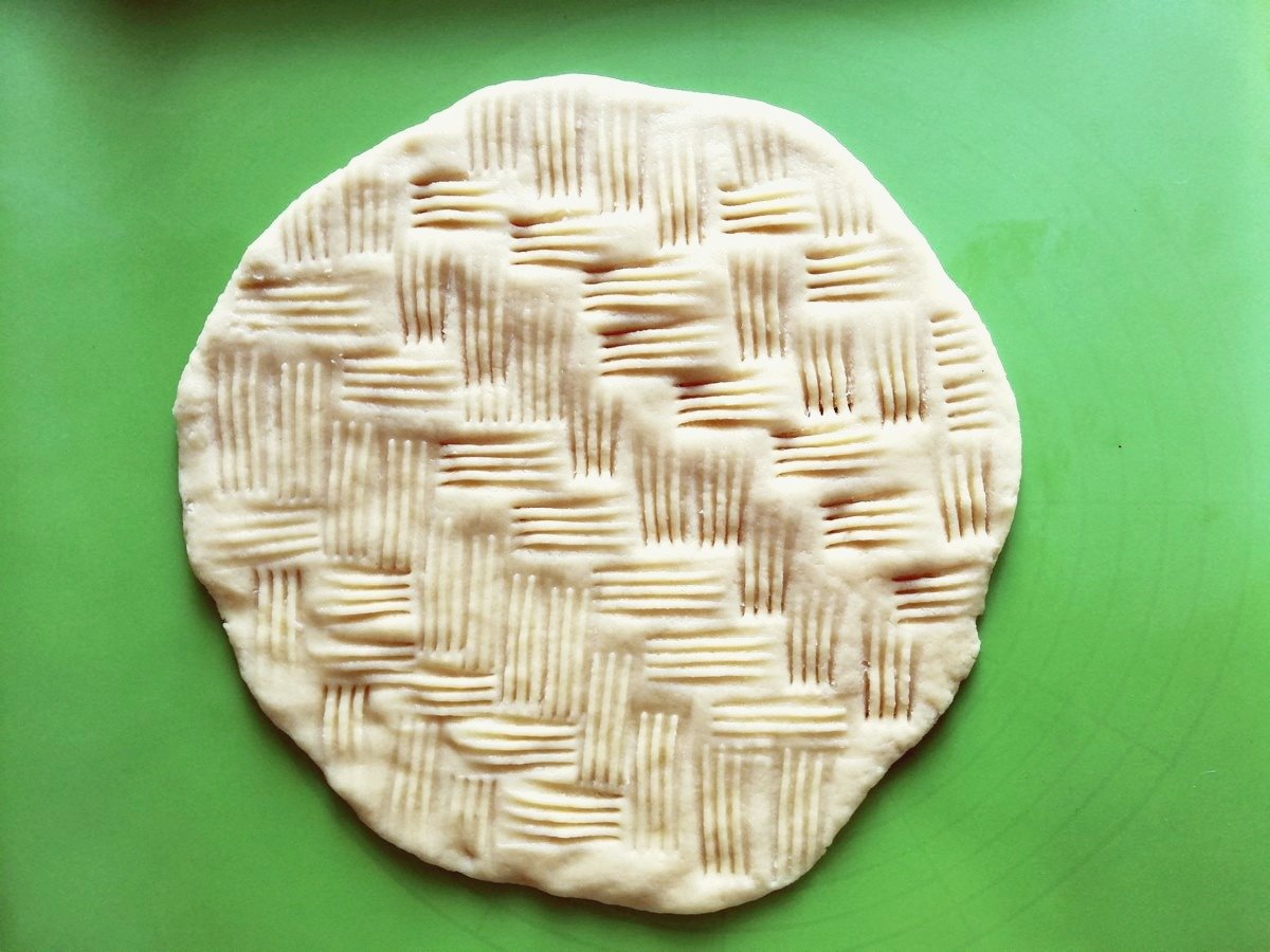- Теперь застели противень пергаментом или используй силиконовый коврик для выпечки. Просто руками разминаем тесто в большой блин высотой 0,5 сантиметра. Затем можешь сделать вилкой узоры, какие тебе нравятся.