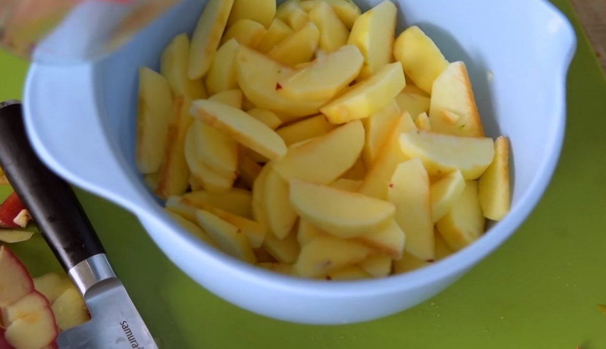 - Далее яблоки нужно нарезать дольками средних размеров и залить их лимонным соком, перемешай. Можешь делать это по частям, чтобы лимонный сок не дал яблокам потемнеть.