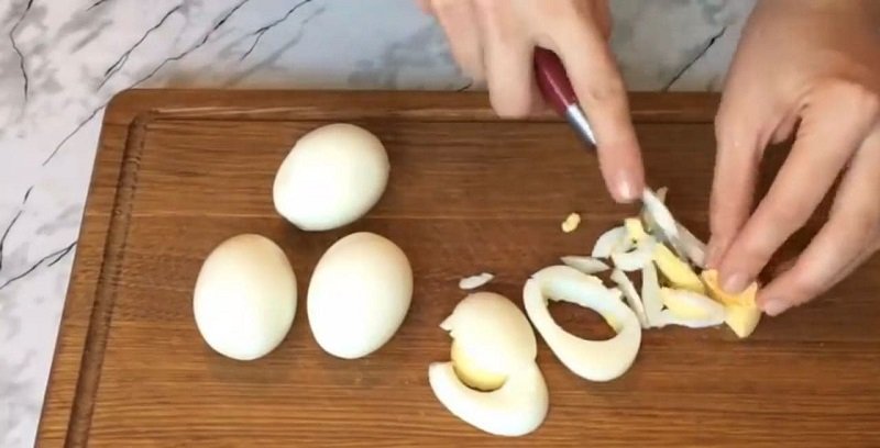 © Youtube - Вареные яйца и куриные сердца нарезаем соломкой, а сыр натираем на крупной терке.