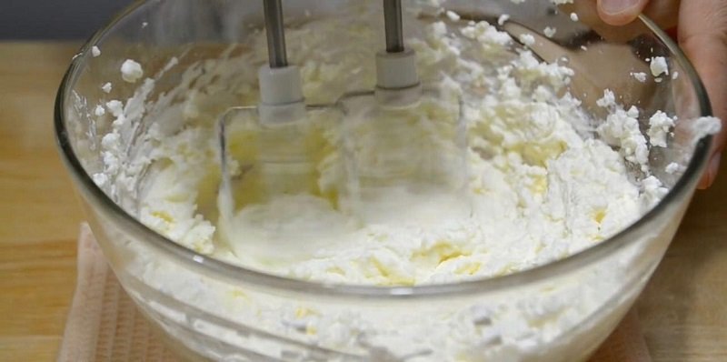 Переходим к приготовлению самого бисквита, когда заварная масса остынет. Отделяем яичные желтки от белков. Белки нужно взбить до появления пены. Затем добавить к ним сахар и продолжить взбивать, пока белковая масса не станет плотной. После смешиваем ее с желтками, не взбивая. Таким же образом домешиваем заварную основу. Должна получиться однородная масса.