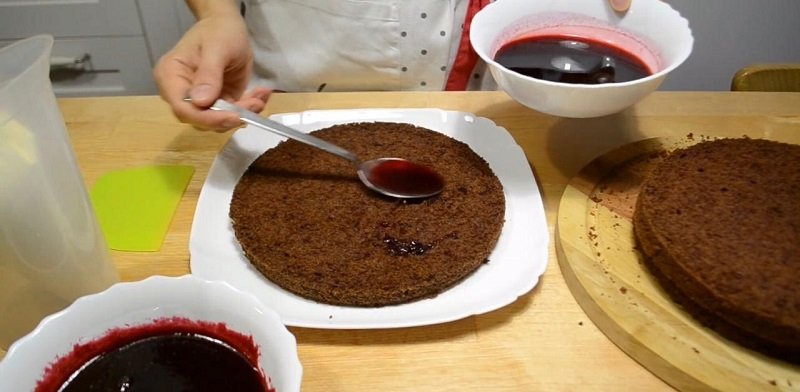 Накрываем вторым коржом. Снова пропитываем, затем в ход идет джем и два вида крема. То же самое проделываем и с третьим коржом.