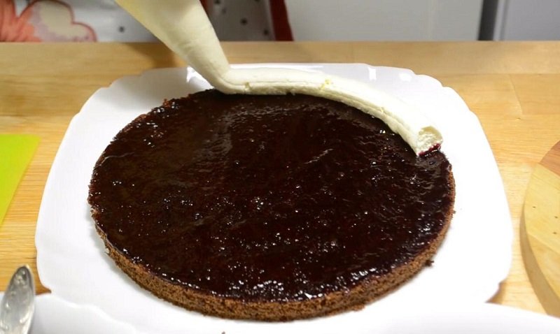 - Разрезаем бисквит на три коржа. Для первой — смородиновой прослойки — берем джем, а для пропитки — компот или сироп. Затем делаем ободок сырным кремом, а сливочным намазываем внутри.