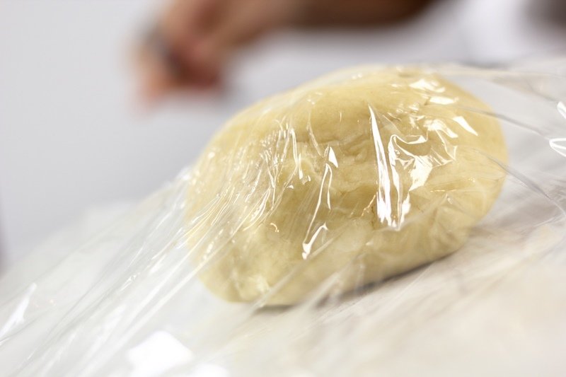- Потом сними с теста пленку и вымеси его еще раз в течение 3–5 минут. В результате оно станет более мягким и эластичным. Затем снова заверни тесто в пищевую пленку и оставь на 30 минут.