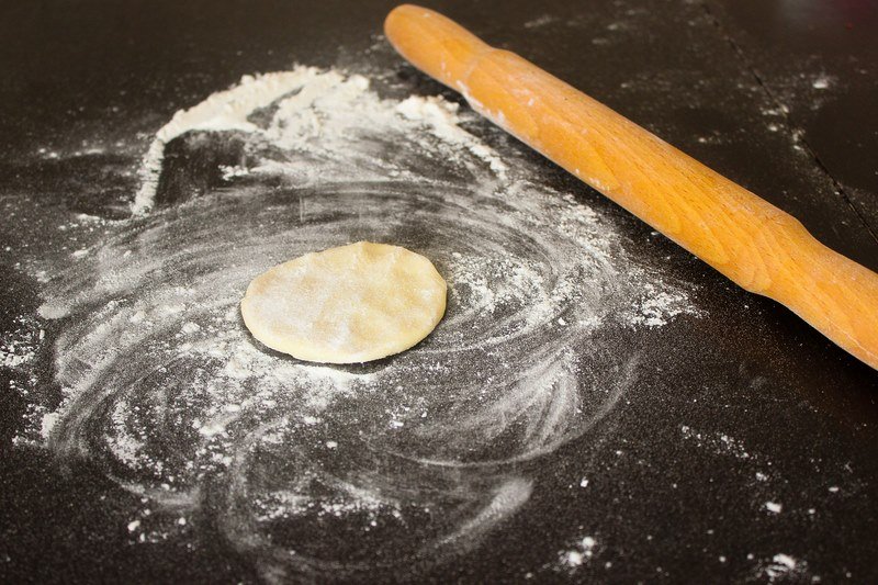 Снова вернемся к тесту. Рабочую поверхность посыпь картофельным крахмалом, чтобы тесто не прилипало. Раздели тесто на 2 равные части. Каждую раскатай в длинный жгут. Потом раздели его на 4 части, каждую часть — еще на 3. С помощью скалки раскатай каждый кусочек в лепешку толщиной приблизительно 1 мм. Воспользуйся формой для печенья, чтобы вырезать ровные кружки.