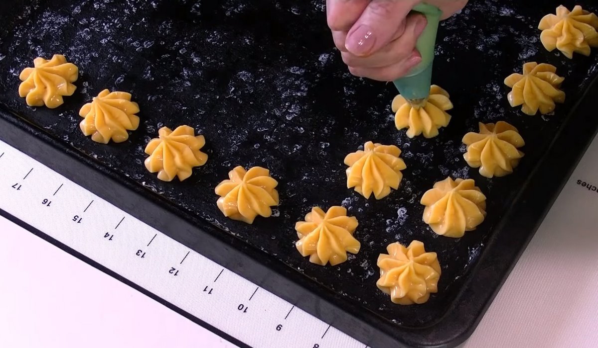 - Противен можешь просто смазать маслом или застелить пергаментом. Далее выдавливай из мешка небольшие порции теста на расстоянии друг от друга. Учти, что они будут увеличиваться в размере.
