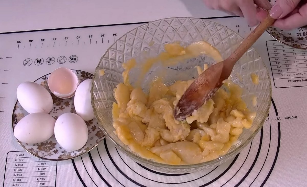 А теперь к самому важному моменту. Когда заварная часть будет слегка теплой температуры, то есть не будет обжигать руку, нужно по одному добавлять яйца.