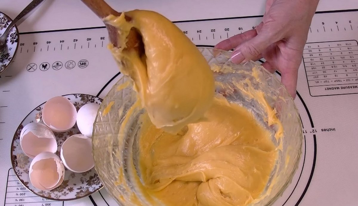 Тесто готово, когда оно не плотное и не слишком жидкое. То есть если взять тесто на лопатку, и оно там держится и даже не думает падать, то оно слишком густое. Нужно добавить еще яйцо. Главное — не сделать тесто слишком жидким!