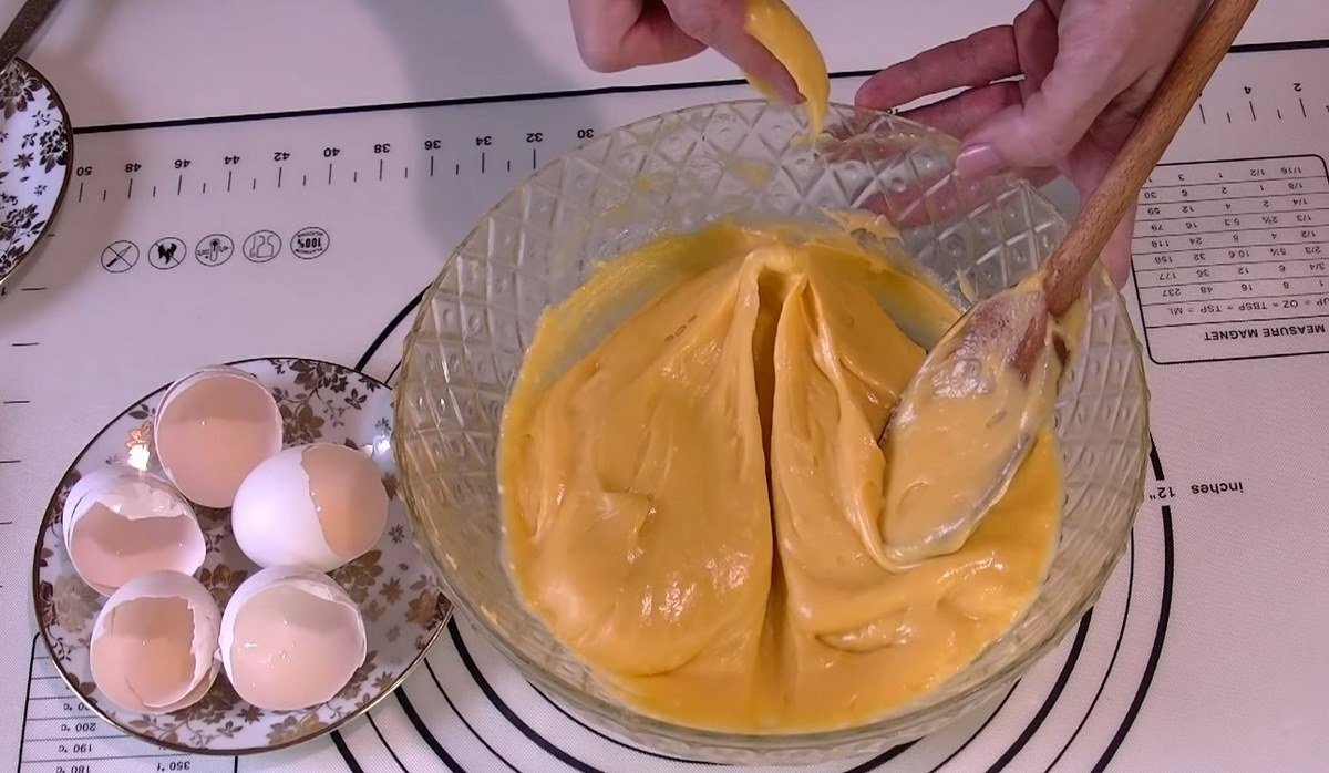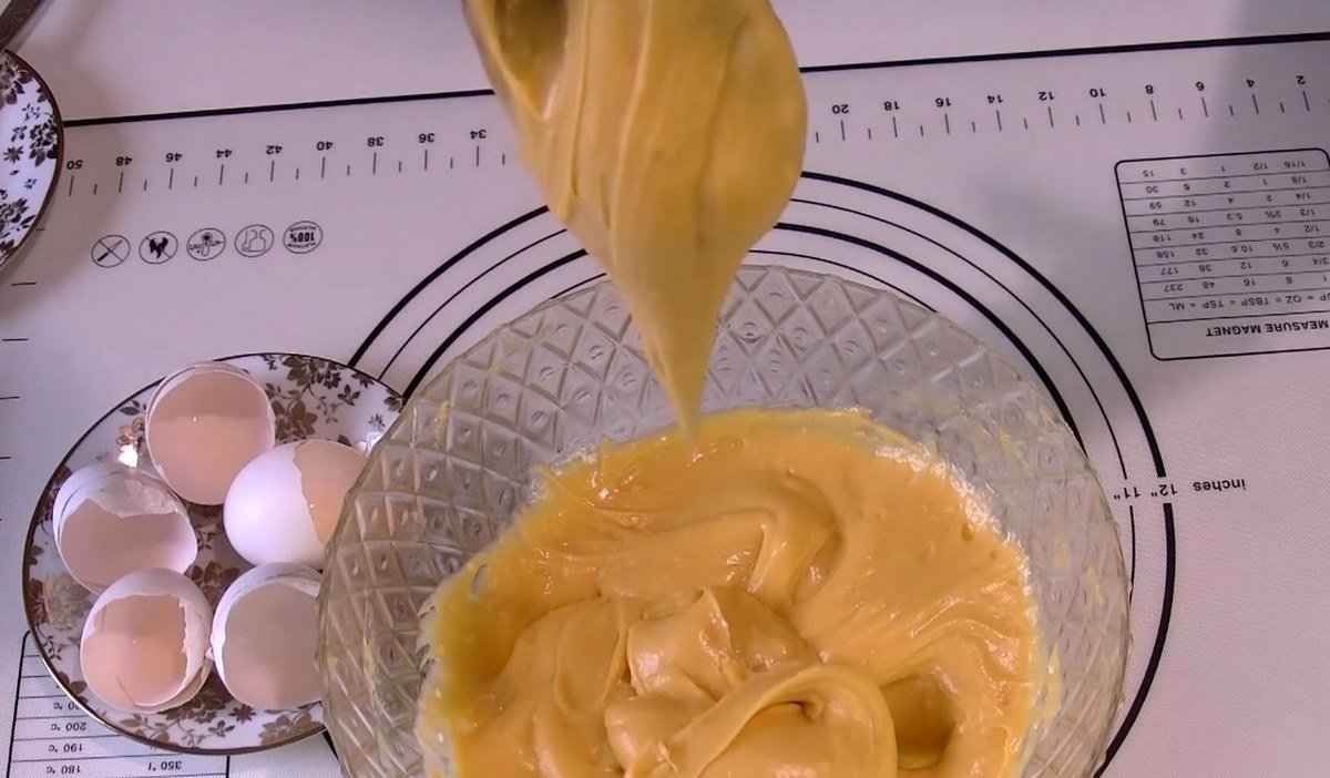 Поэтому яйца нужно добавлять по одному, вымешивая лопаткой до однородности, и только потом добавлять следующее.