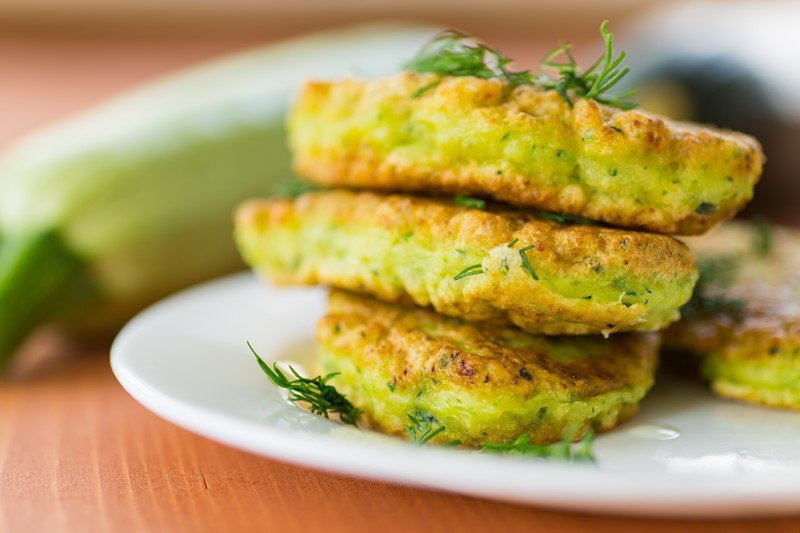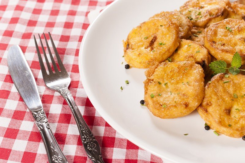 Заметим также, что жареные кабачки выйдут не только вкуснее, но и полезнее, чем большинство аналогичных блюд. 100 грамм кабачков содержат всего 20 килокалорий! Кроме того, кабачок богат крахмалом и клетчаткой: отлично насыщает, не допускает переедания и улучшает пищеварение. Сплошные плюсы!