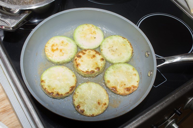 - Разогрей сковороду, вылей на нее оливковое масло и слегка прогрей его. Теперь уменьши огонь до минимума. Каждый ломтик кабачка аккуратно обваляй в муке со специями, после чего прожарь до золотистой корочки.